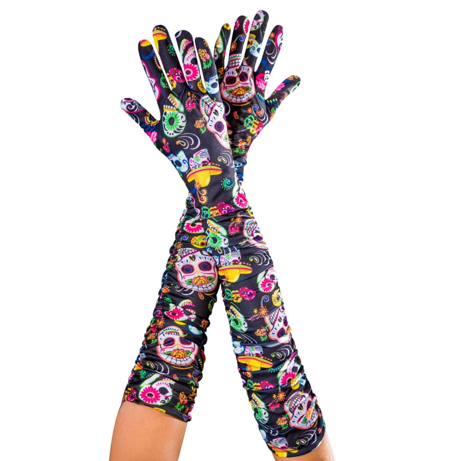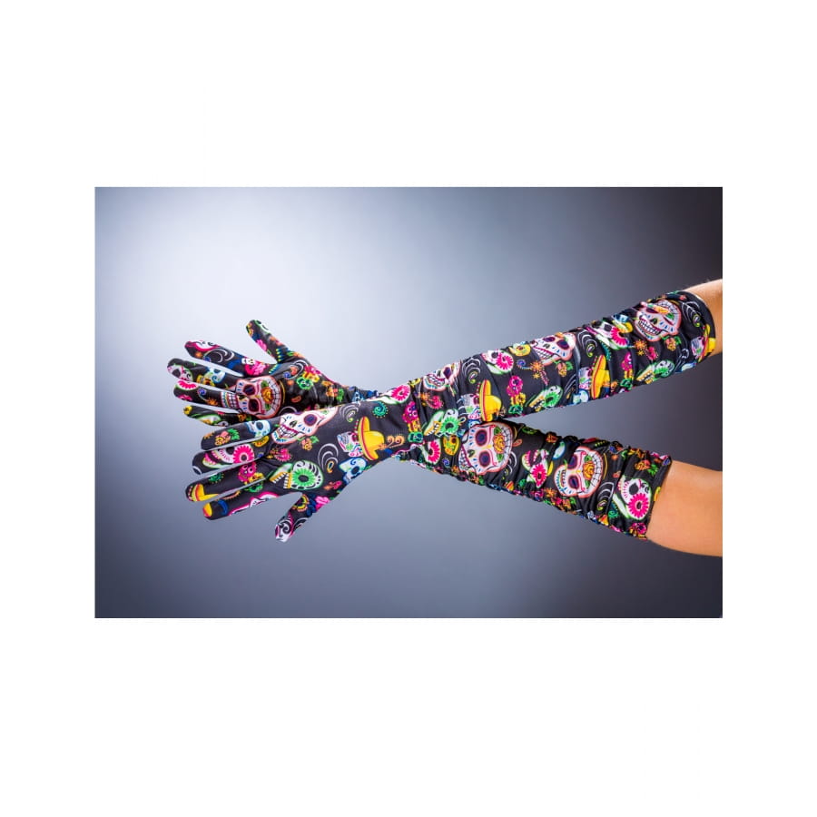 La paire de gants longs avec têtes de mort est un accessoire pour femme.