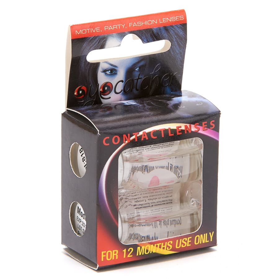 Ces lentilles représentent des yeux avec un coeur rouge à la place de l'iris sur un fond blanc.