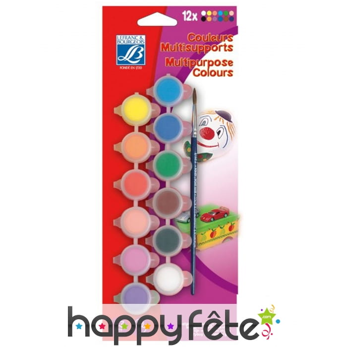 On retrouve dans le paquet 12 petits pots d'une contenance de 5 ml (orange, saumon, jaune, bleu clair, rose, violet, rouge, bleu foncé, vert kaki, marron, blanc et vert), ainsi qu'un pinceau de taille 8 haut de 17 cm.