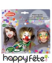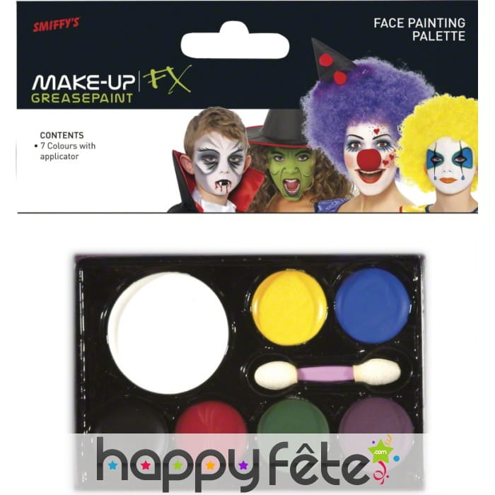 Palette de maquillage contenant 7 couleurs et un pinceau applicateur. Les couleurs comprises sont le blanc, le noir, le jaune, le bleu, le violet, le rouge et le vert. Vous pouvez également l'appliquer avec une éponge ou à la main. Les produits sont hypoallergéniques et non toxiques, parfaits pour les enfants.
