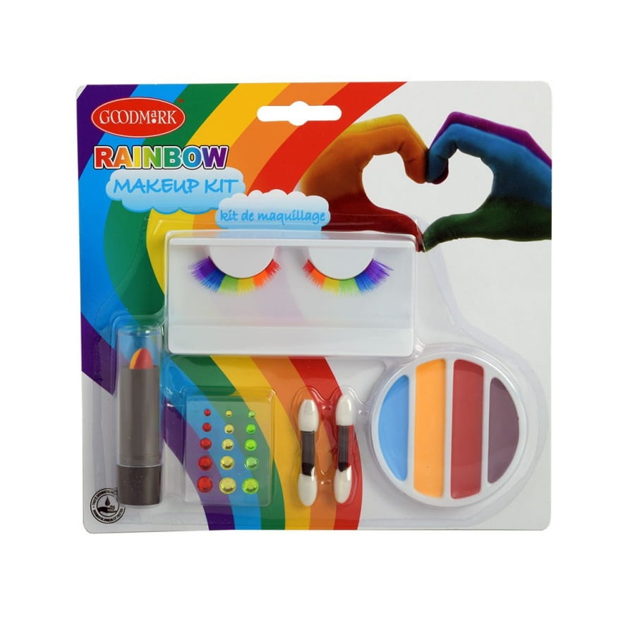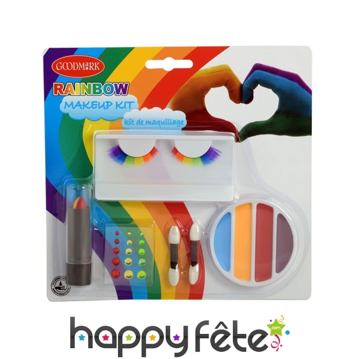 La palette de maquillage et faux cils arc-en-ciel sont des produits cosmétiques destinés aux femmes.