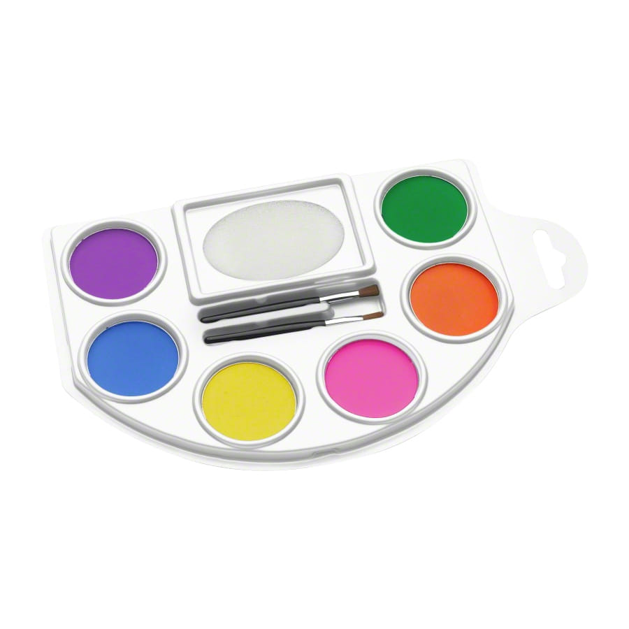 Palette AquaColor pour le visage et pour le corps, constitué de 6 couleurs fluorescentes qui réagissent aux rayons ultra-violets. Utilisez le pinceau fourni ou une éponge humide pour appliquer le maquillage et enlevez ensuite le tout avec un peu d'eau. Ce maquillage est hypoallergénique et non toxique. Les couleurs incluses sont le bleu, le jaune, le rose, le vert, le violet et l'orange.
