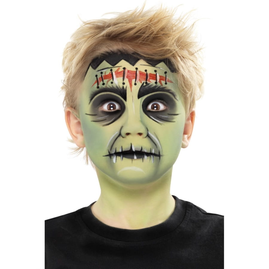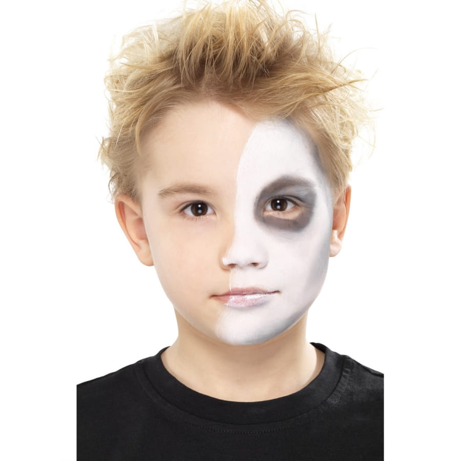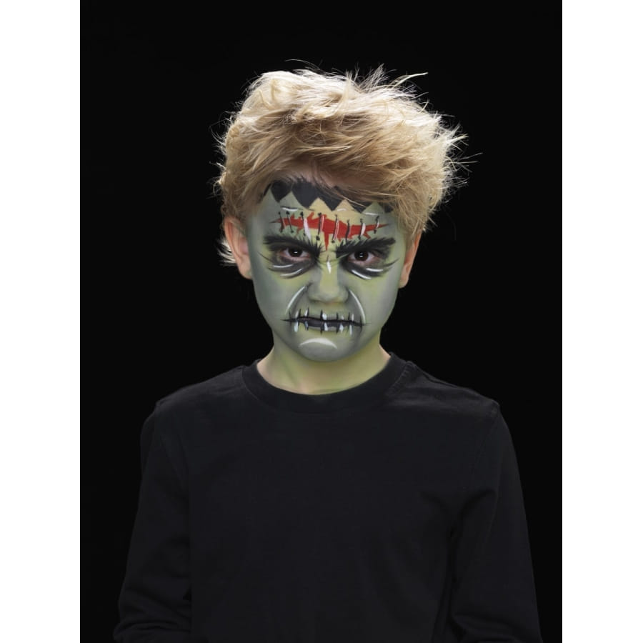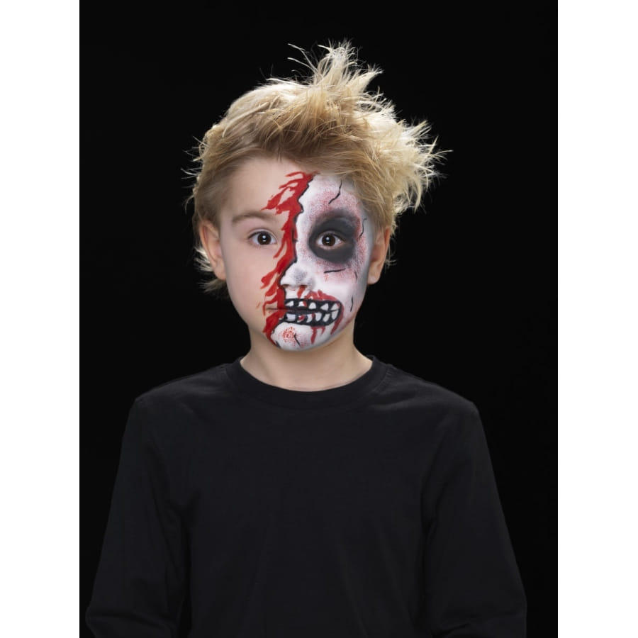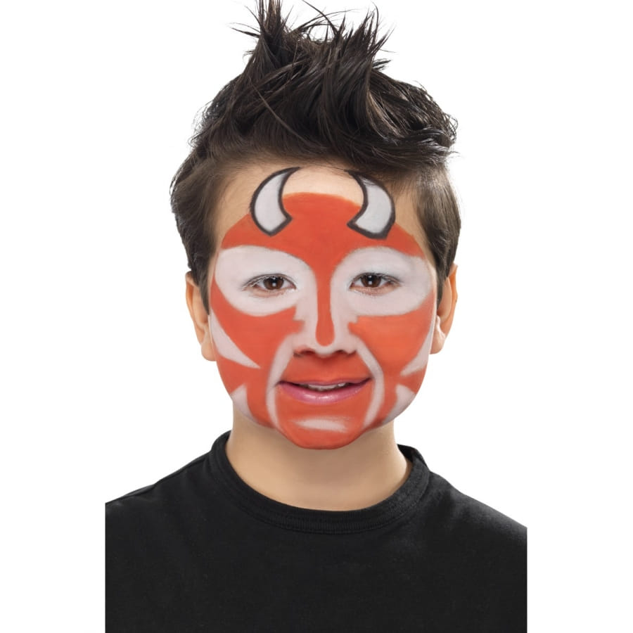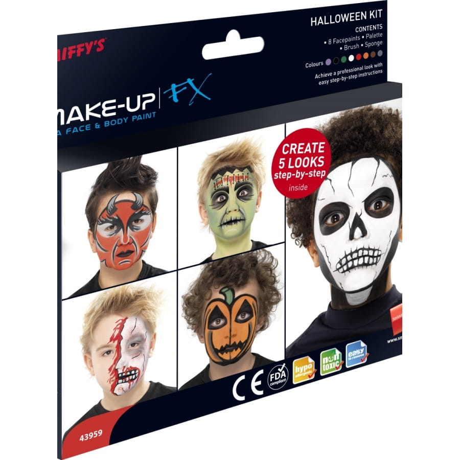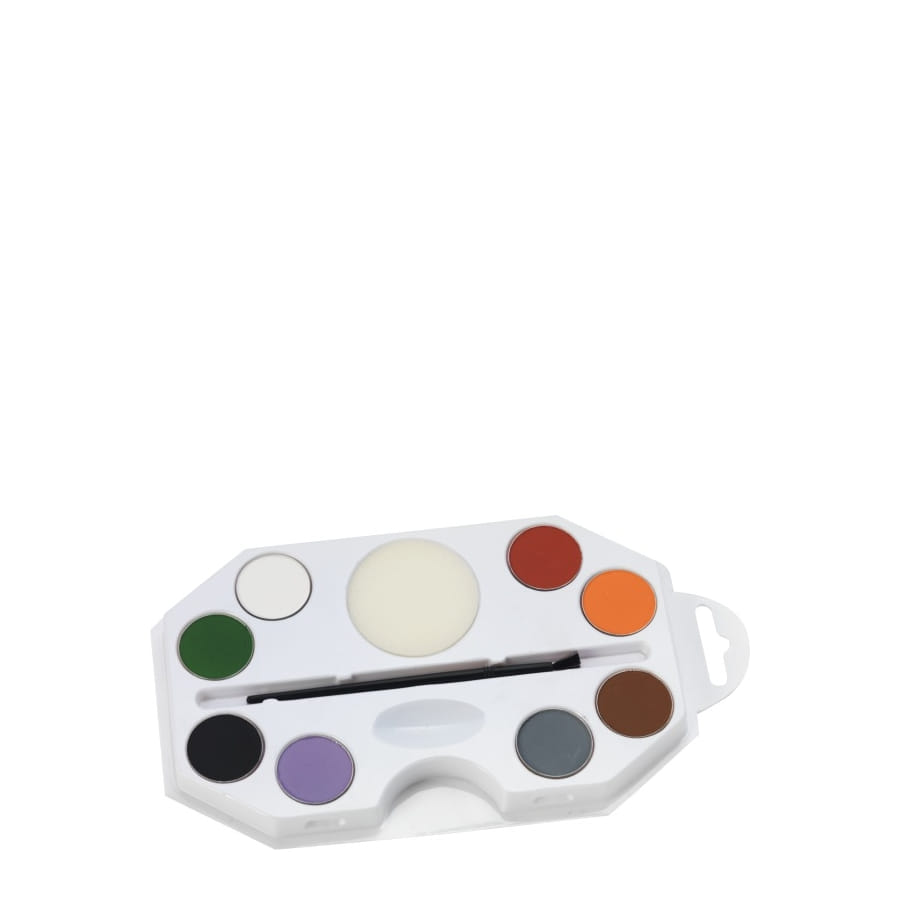 Kit de maquillage d'Halloween pour adultes et enfants composé d'une palette de 8 couleurs, d'une éponge et d'un pinceau applicateur. Les couleurs incluses sont le blanc, le vert, le rouge, l'orange, le noir, le violet, le bleue et le marron. Le tout vous permettra de créér un maquillage original.