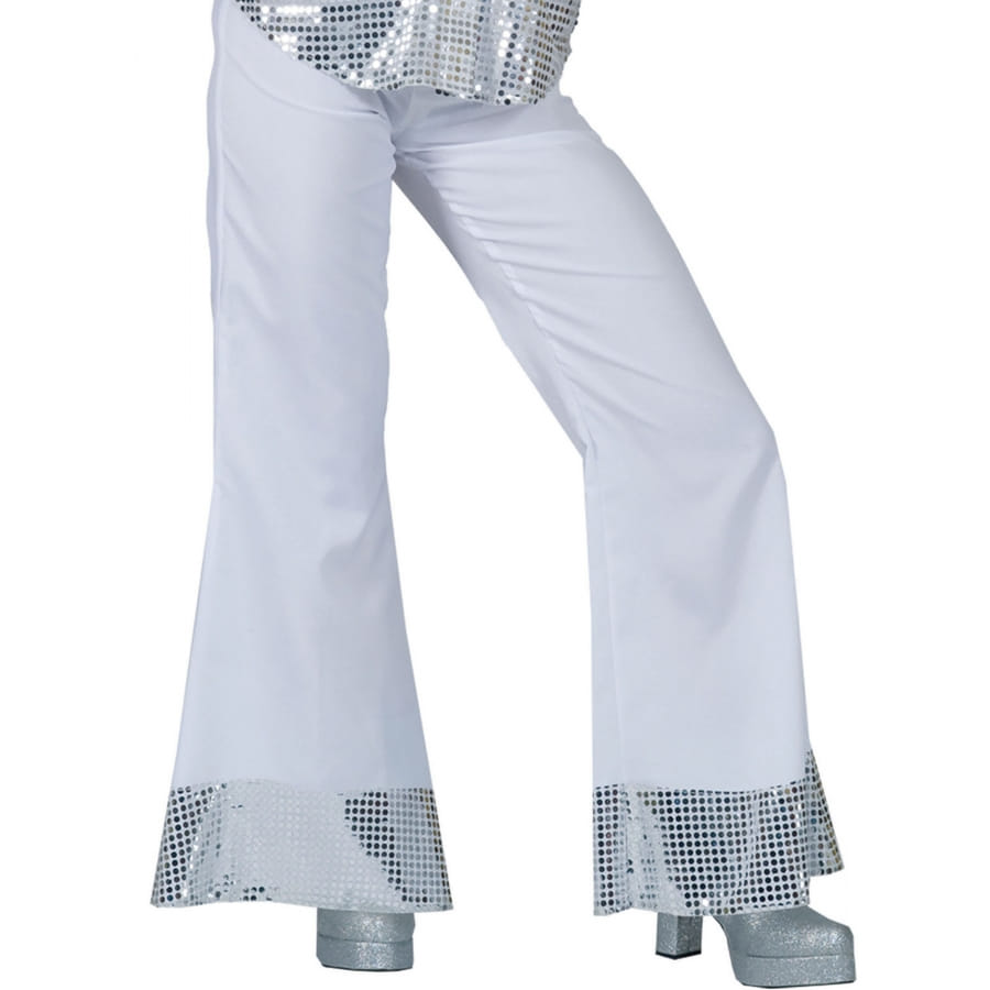 Le pantalon blanc disco bords argentés pour femme est le complément idéal pour votre look disco.