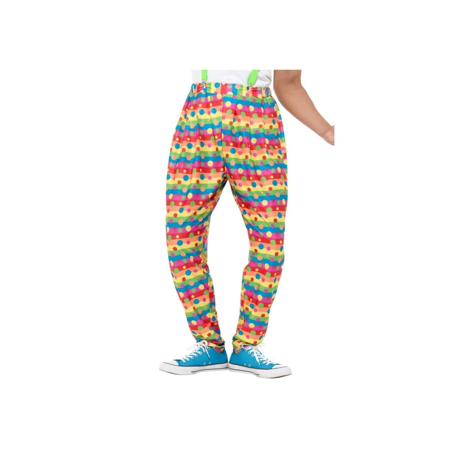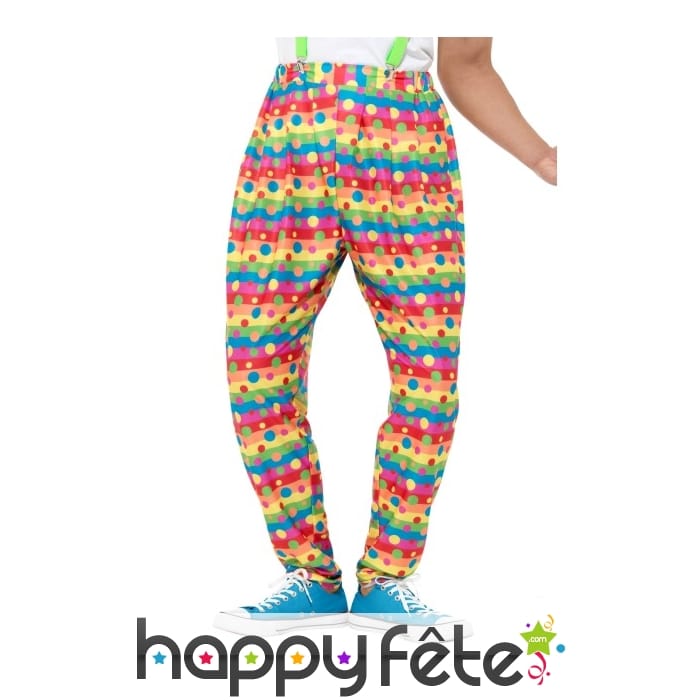 Soyez prêts à changer l'atmosphère dans votre look tout en couleurs ! Bienvenue dans le monde du cirque avec le pantalon de clown à pois, multicolore. A la fois ample et confortable, ce vêtement présente des rayures multicolores disposées comme un arc en ciel, ainsi que des pois multicolores éparpillés un peu partout.