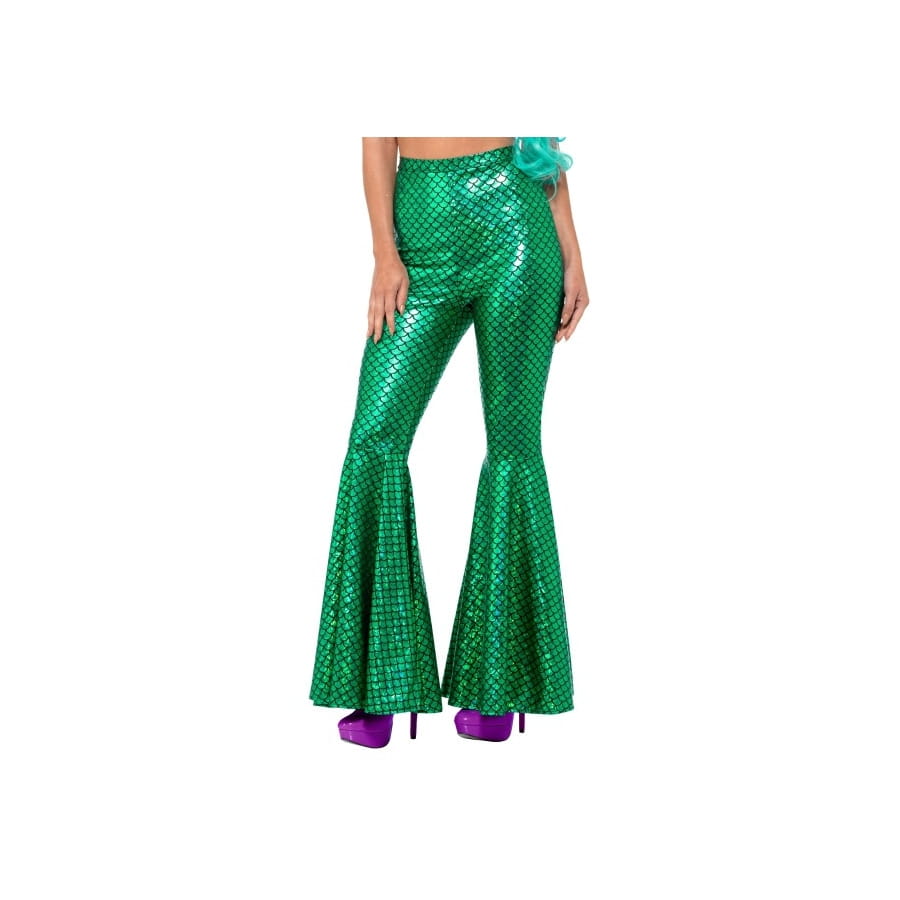 Les sirènes figurent parmi les plus merveilleuses créatures de contes de fée. Découvrez un ravissant pantalon écailles de sirène patte d'eph à porter pour une soirée inoubliable. Le tissu est confortable, de couleur verte avec un aspect légèrement brillant et une texture en écailles. Il s'agit d'un modèle à pattes d'éléphant qui se porte idéalement avec des talons hauts.