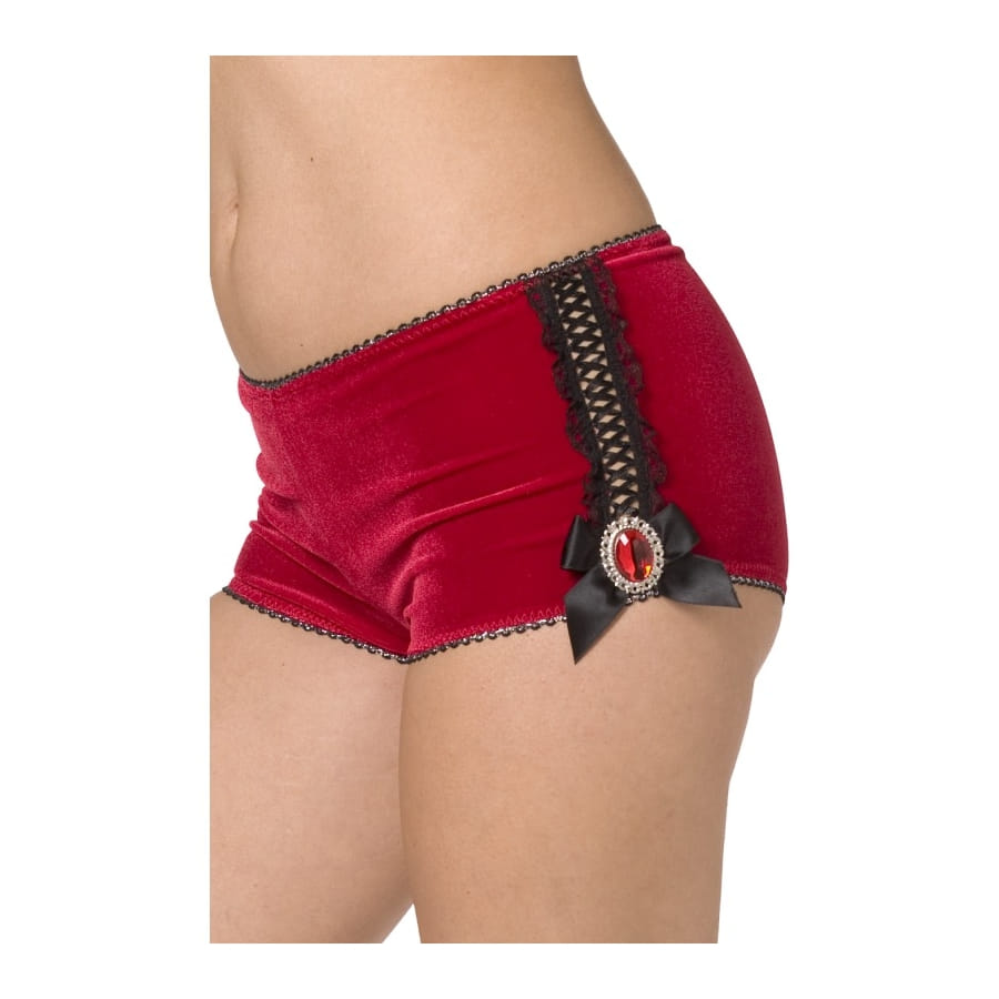 Jolie petit short-culotte en velours rouge, avec dentelle, lacets et noeuds noirs sur chaque côté ainsi qu'une pierre rouge. Utilisez ce sous-vêtement pour une soirée romantique avec votre partenaire.