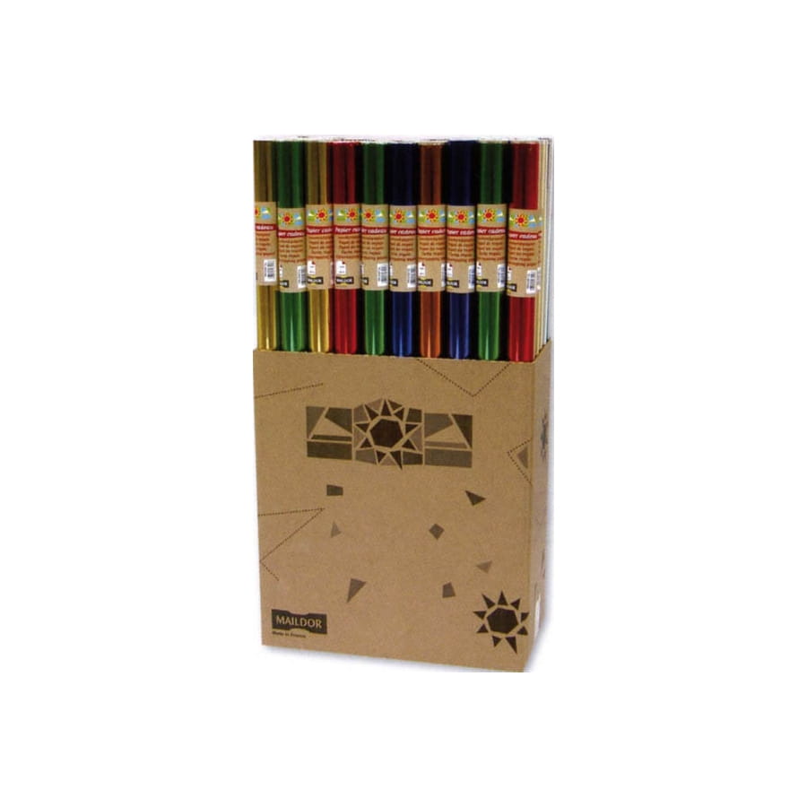 Rouleau de papier cadeau brillant et fluide en polypropylène avec une surface de couleur et l'autre argentée. La taille du papier est de 1 mètres de large sur 10 mètres de longueur. Lors de la commande, vous pourrez choisir entre les modèles 21, 34, 47 et 64. Vous pouvez utiliser ce papier comme décoration ou comme emballage.