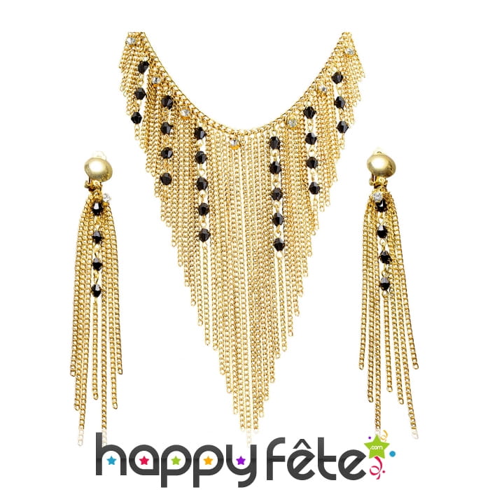 Le collier est fait d'un grand nombre de petites chaînes et de fausses pierres précieuses (noires et blanches) qui tomberont sur votre poitrine.