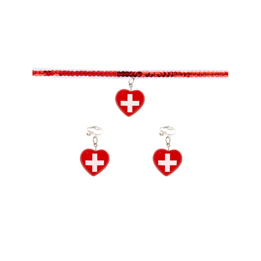 Cette parure comporte un ras de cou rouge avec pendentif en forme de coeur rouge sur lequel est imprimée une croix blanche, en référence au corps médical.
