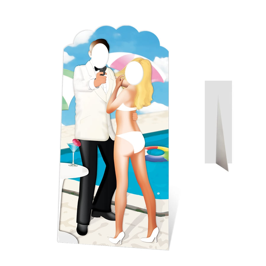 Jouez aux agents secrets sexy en couple en prenant une photo avec ce passe-tête agent secret et bimbo. Vous verrez sur ce passe-tête de 193 cm de haut un agent secret en smoking noir et blanc avec une bimbo portant un bikini blanc au bord d'une piscine et d'un ciel bleu. Il est en carton et possède une découpe au niveau des visages pour que vous y placiez vos têtes.
