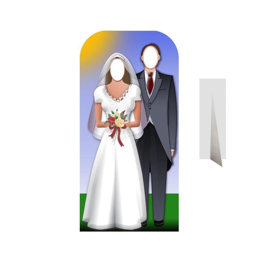 Vive les mariés ! Nous vous proposons cette silhouette géante représentant un beau couple de mariés, mesurant 186 cm (taille adulte), fait en carton, avec découpe pour passer le visage (2 têtes) et prendre des photos. Ce sera un décor parfait pour une heureuse et inoubliable fête de mariage.