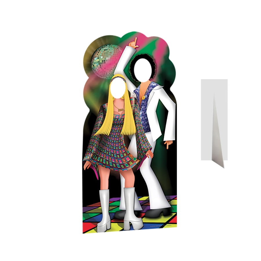 Le roi et la reine du disco, voilà ce que vous serez si vous prenez une photo avec ce passe-tête disco de couple en carton, représentant un couple qui danse fougueusement sur la piste de danse, sous une boule à facettes. Cette figurine multicolore est de taille adulte car a une hauteur de 190 cm. Elle a des découpes par lesquelles vous mettrez vos têtes pour donner vos visages à ce couple.