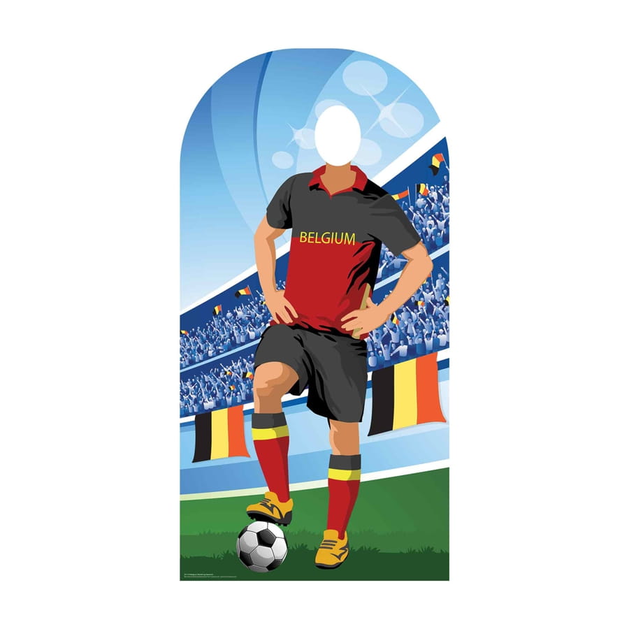 Elle fait 190 cm x 96 cm et présente un joueur de foot balle au pied, portant le maillot de l'équipe de Belgique.