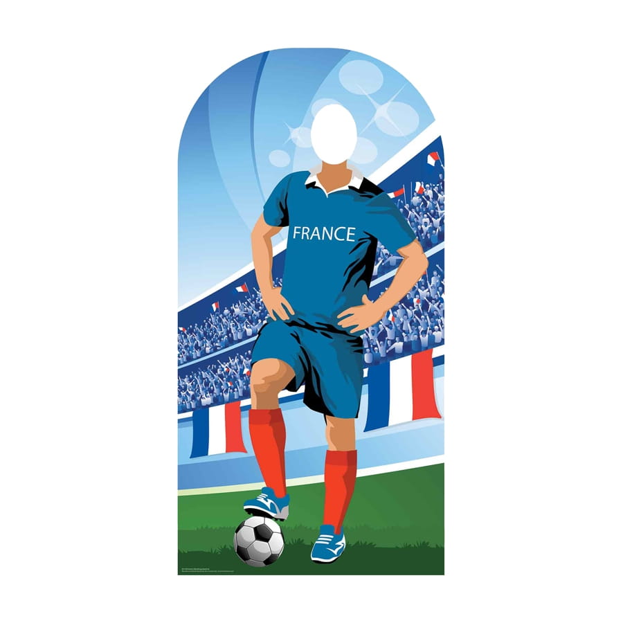 Nous parlons ici d'une figurine passe-tête géante de 190 x 96 cm en carton plat, représentant un joueur de foot attendant de jouer un coup de pied arrêté.