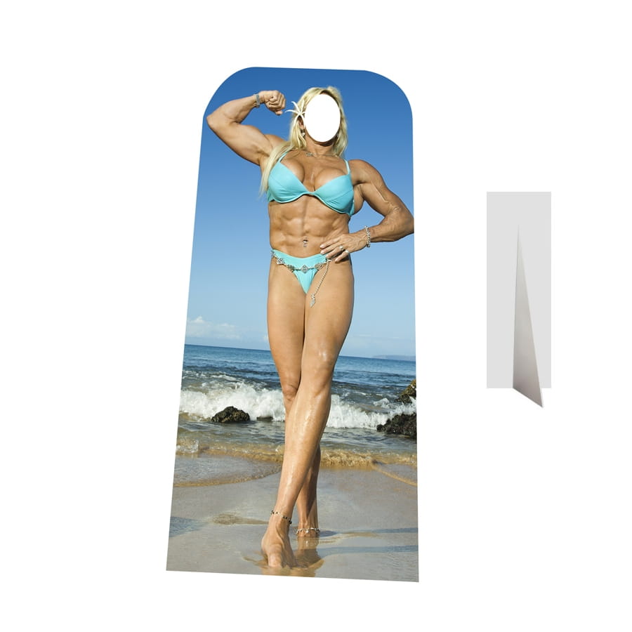 Une photo avec ce passe-tête femme musclée culturiste est l'une de ces photos cultes que l'on ressort après quelques années pour se remémorer quelques souvenirs et provoquer de bons fous rires. Ce passe-tête en carton que nous avons ici a une hauteur de 186 cm et est de couleur beige et bleue. En effet, la femme musclée porte un bikini de couleur bleu clair au bord de la mer.