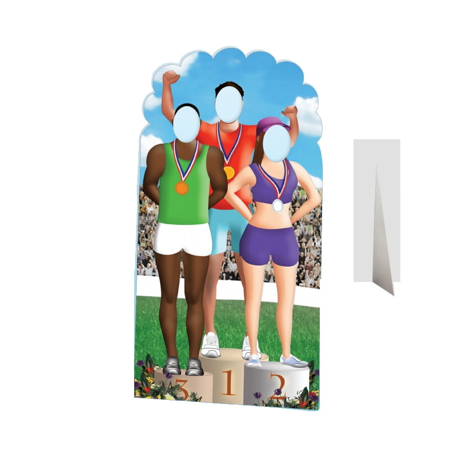 Il faut trois personnes pour prendre une photo avec ce passe-tête de sportifs sur podium. En effet sur ce passe-tête, trois sportifs sont dessinés, dont deux hommes et une femme, portant des vêtements multicolores avec leurs médailles respectives. Il est de 195 cm de haut et est en carton. Les découpes au niveau des visages des sportifs vous permettront de leur donner vos visages et de prendre une photo.