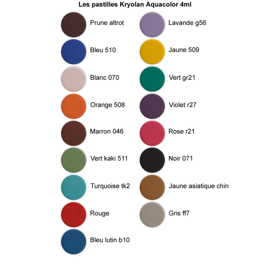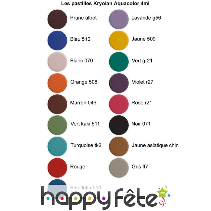 Kryolan est un professionnel des produits de cosmétique. Il propose ainsi l'aquacolor qui est un maquillage à l'eau ici vendu sous la forme d'une pastille de maquillage de 4ml. A utiliser normalement ou pour compléter une palette de maquillage (en tant que recharge). L'aquacolor s'utilise pour le visage mais aussi pour le corps, idéal pour de nombreuses utilisation comme les grimages ou le body painting lors d’événements comme le carnaval, un anniversaire ou Halloween. La pastille de 4ml est vendue à l'unité. Les couleurs disponibles sont les suivantes (voir nuancier) : Marron 046, Orange 508, Blanc 070, Bleu 510, Bleu lutin b10, Jaune asiatique chin, Gris ff7, Lavande g56, Vert gr21, Jaune 509, Prune altrot, Lila, Noir 071, Orange, Rose r21, Violet r27, Rose r30, Rouge, Turquoise tk2, Vert kaki 511.