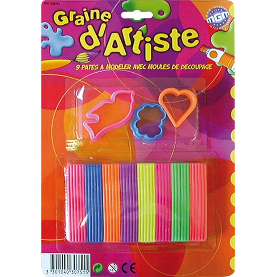 Boîte de pâte à modeler contenant 9 bâtons de pâte de couleur rose, bleue, orange, violette, jaune, fuschia, verte et rouge ainsi que 3 moules en forme d'oiseau, de coeur et de nuage. Utilisez votre sens de la créativité pour créér un décor à partir de ces pâtes.