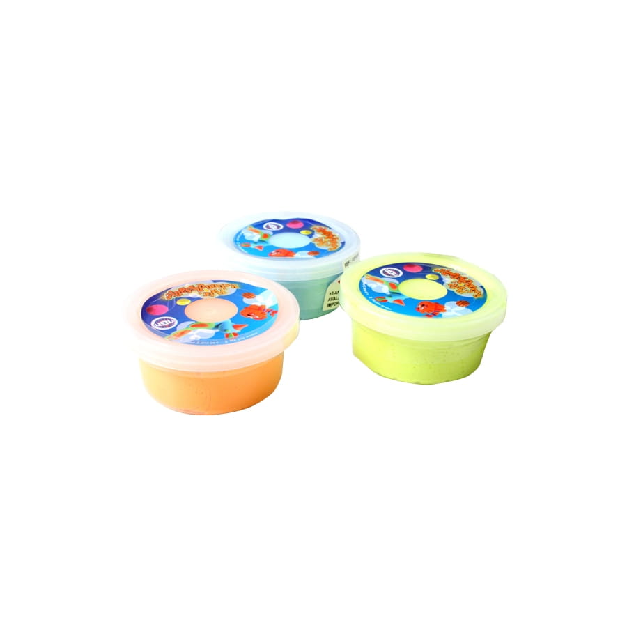 Pâte rebondissante bleue, jaune ou orange. Au moment de passer la commande, vous ne pourrez choisir ni le modèle ni la couleur. Vous obtiendrez une des couleurs disponibles. Modelez la pâte comme vous le souhaitez et amusez-vous à la faire rebondir.
