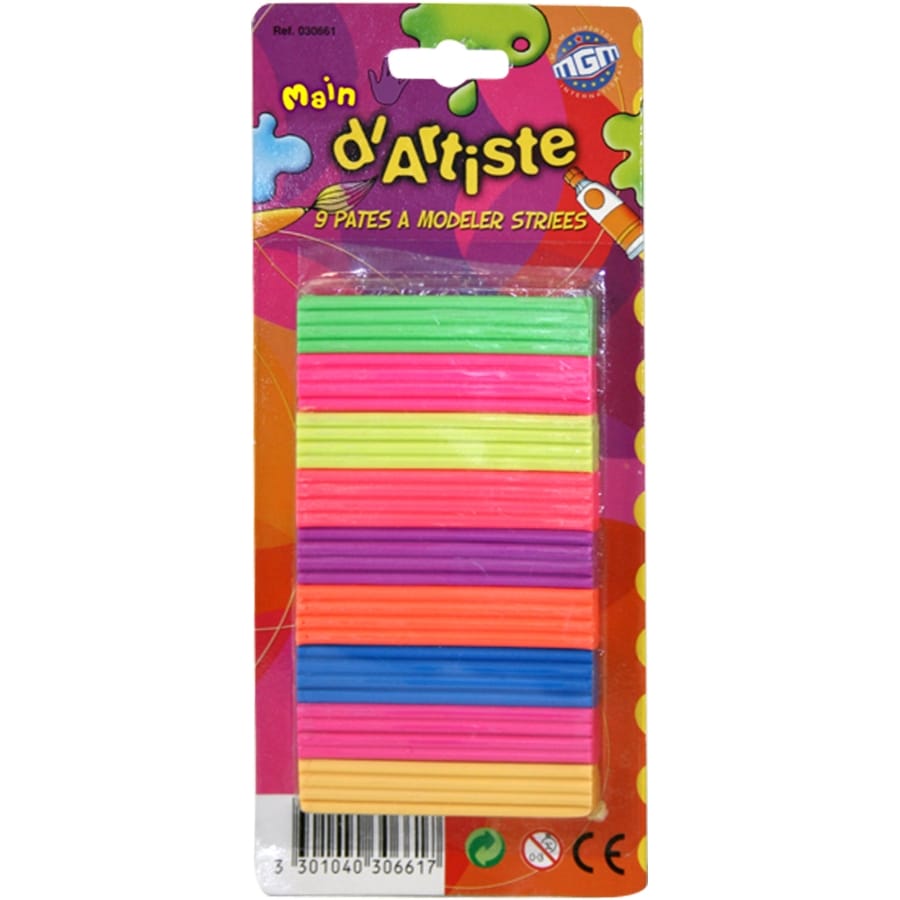 Un blister de 9 pâtes à modeler striées, vous pourrez vous en servir durant un anniversaire d'enfant pour leur aider a laisser parler leur créativité.De couleur rose, bleu, violet, orange , jaune, rouge ces pâtes à modeler vous serviront.