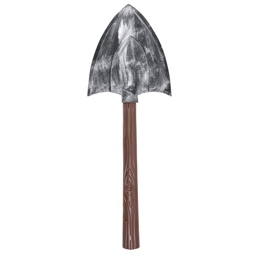 L'accessoire représente une lame de pelle en effet métal gris décati, fixée sur un petit manche en aspect bois de couleur marron.