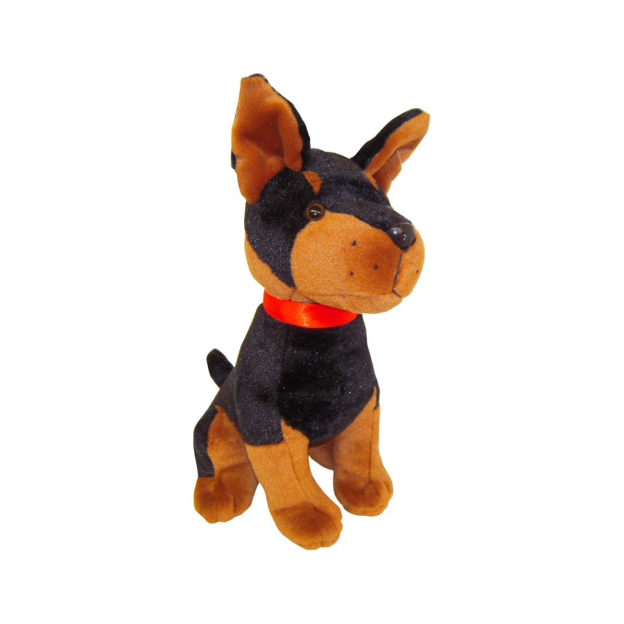 Peluche de rottweiler, de couleur marron, rouge et noire. Le petit chien est en position assise et mesure 30 centimètres. Il est idéal pour vos enfants, à l'occasion de la Noël ou de leur anniversaire.