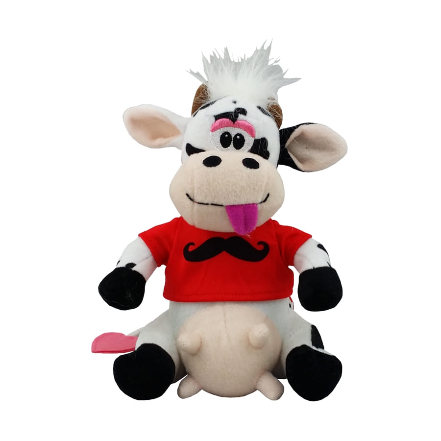Voici une drôle et aimable petite vache en peluche, mesurant 25 cm, qui s'assoit sur ses deux grosses paires de mamelles. Elle tire sa langue pour faire rire tout le monde. Cet animal porte un tee-shirt avec une moustache noire floquée sur le devant. C'est une peluche idéale pour les touts petits, et même pour les plus grands ! Vendu à l'unité, pas de choix des couleurs à la commande, qui pourraient varier de la photo.