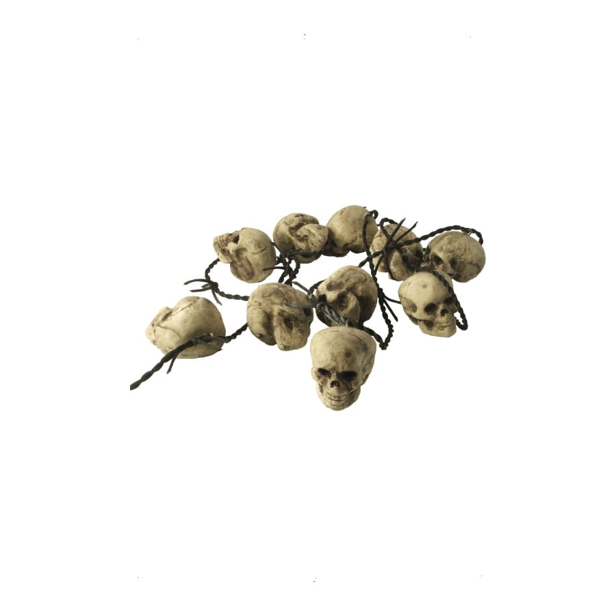 Pendentif gothique en barbelé de couleur noire et composé de 10 têtes de mort, de couleur blanche. Ce pendentif est idéal pour compléter un déguisement de sorcier expert en magie noire, de biker dangereux ou de moissonneur.