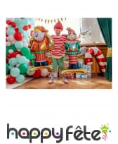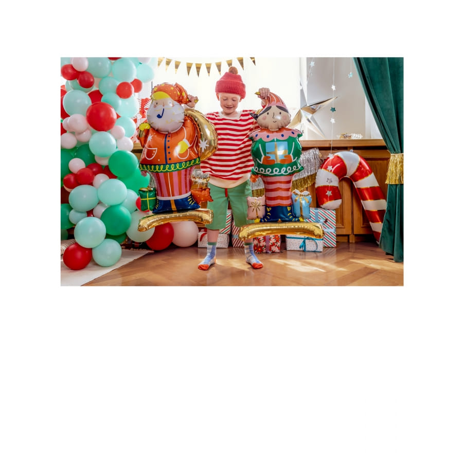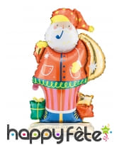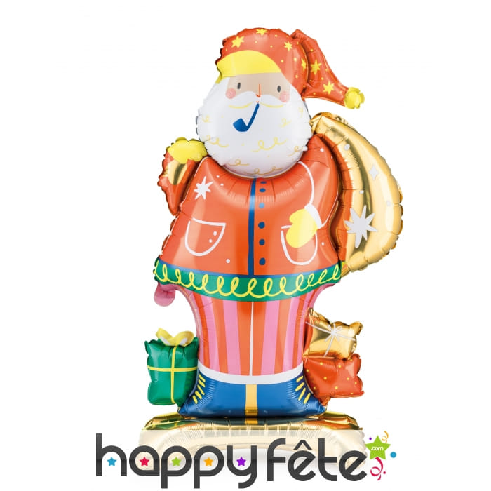 Ce Père Noël ballon est habillé d'un costume rouge (brillant du fait de la matière aluminium), d'une ceinture verte, d'une hotte dorée ainsi que de quelques cadeaux en son socle.