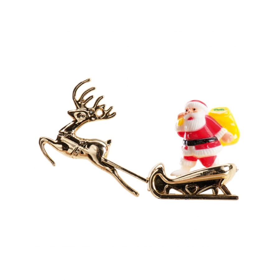 Elle présente un Père noël aux vêtements rouges et blancs classiques monté sur son traîneau tiré par un cerf.