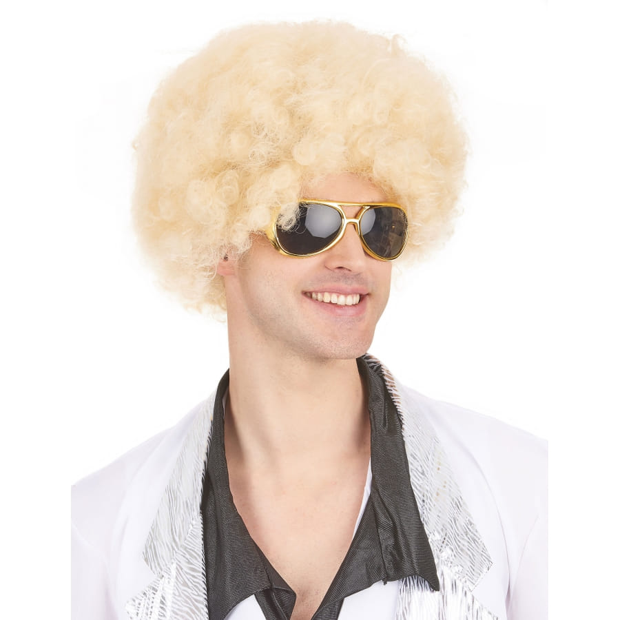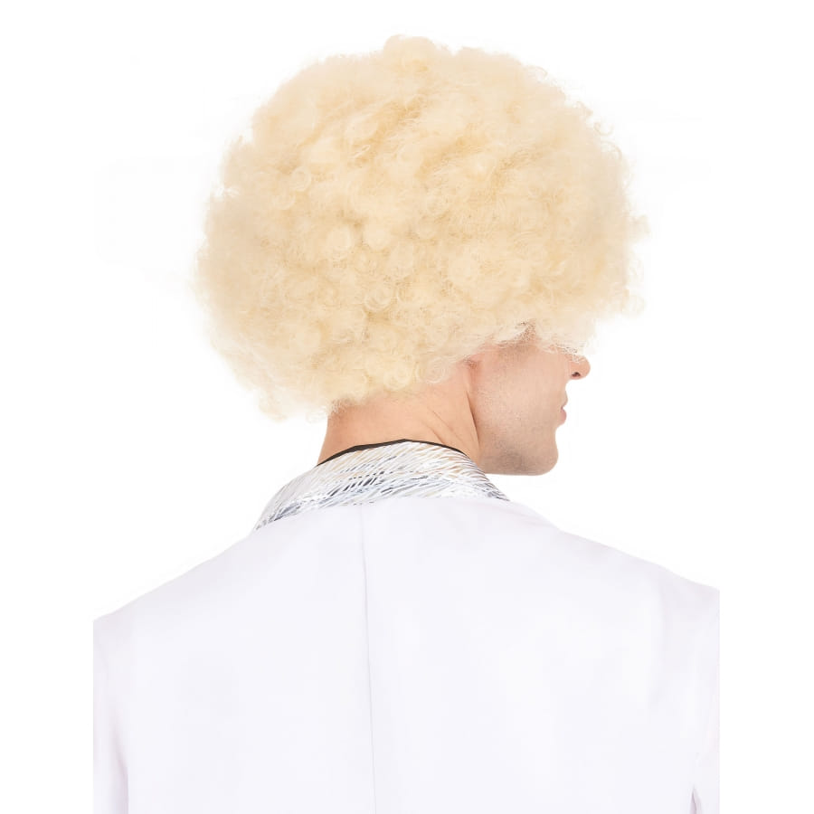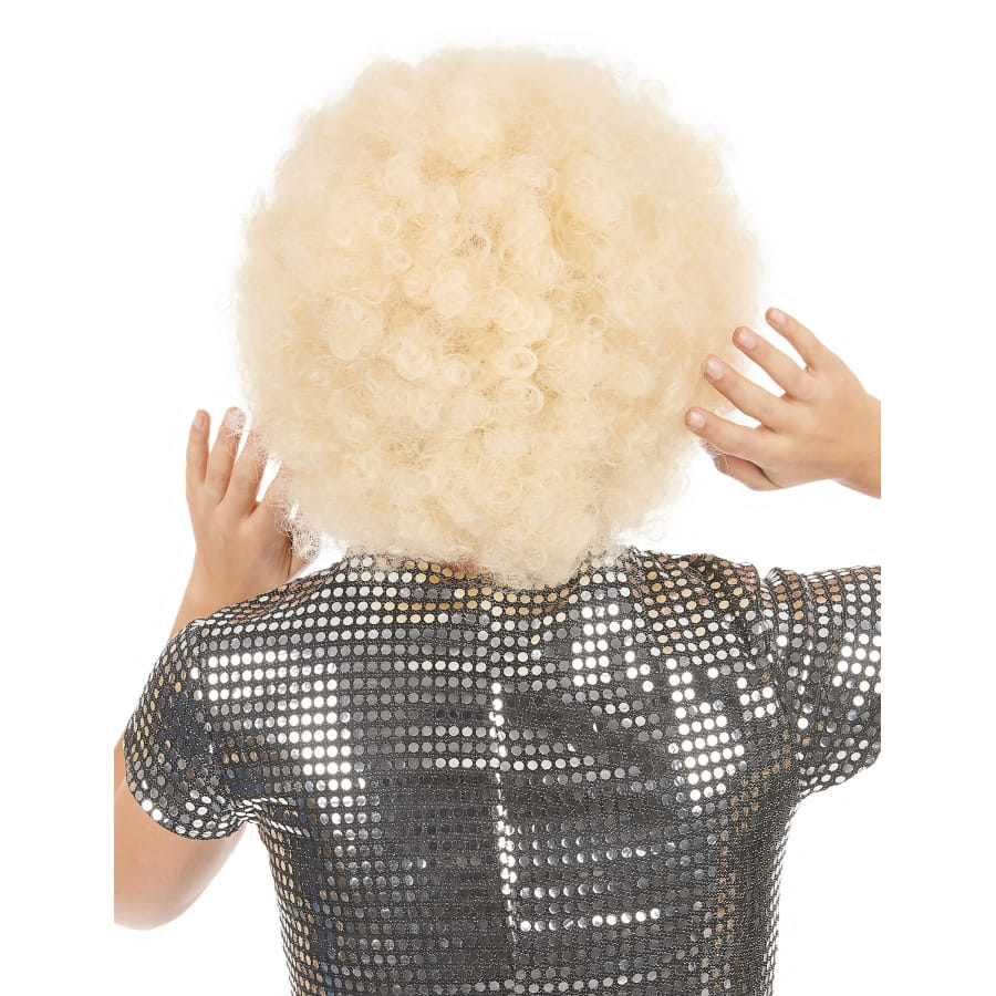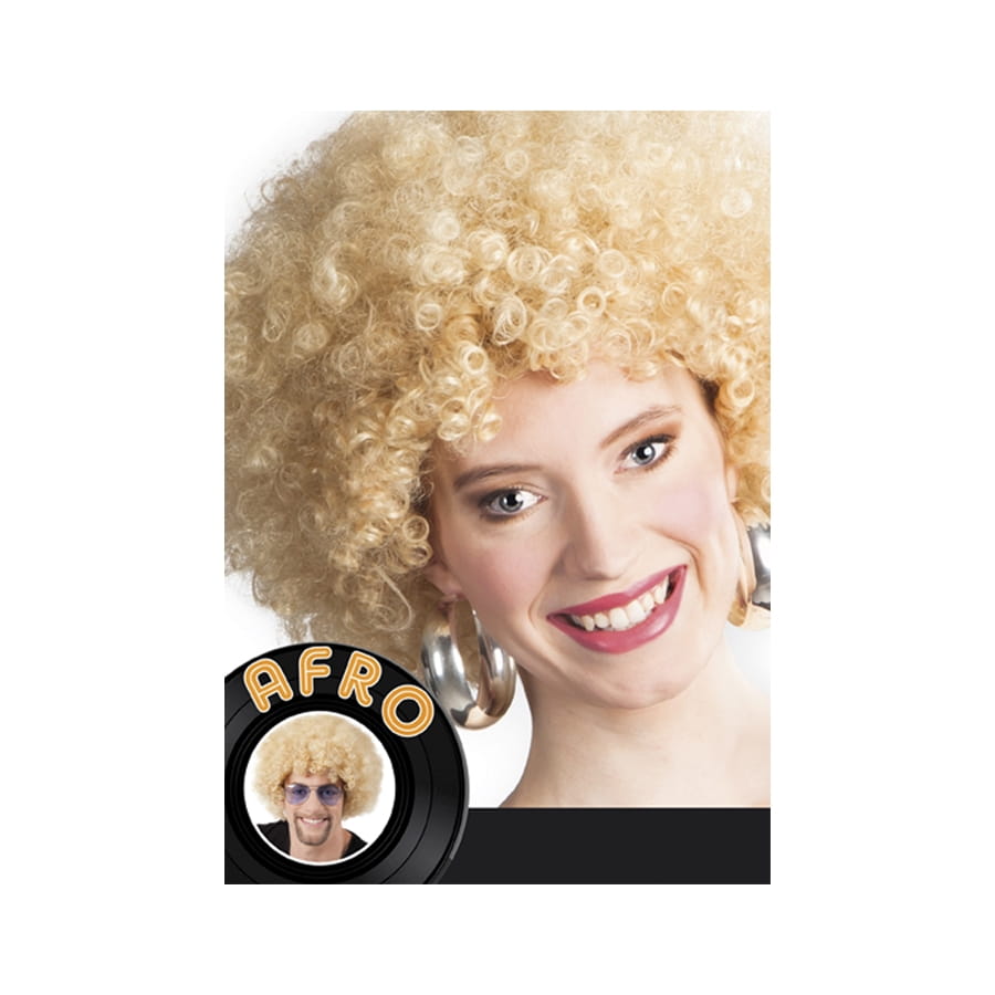 Perruque afro de couleur blonde pour femme. Constituée de cheveux frisés et volumineux, cette perruque contient un filet pour mieux y contenir vos cheveux. Lâchez-vous pour une soirée funky et disco!
