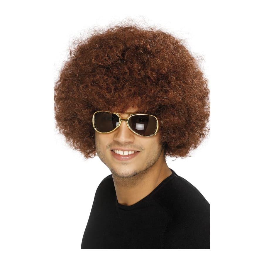 Perruque d'Afro funky de couleur brune pour homme. Cette perruque est faite de cheveux bouclés volumineux. Ajoutez quelques accessoires colorés pour compléter un look flashy pour une soirée disco et paillettes.