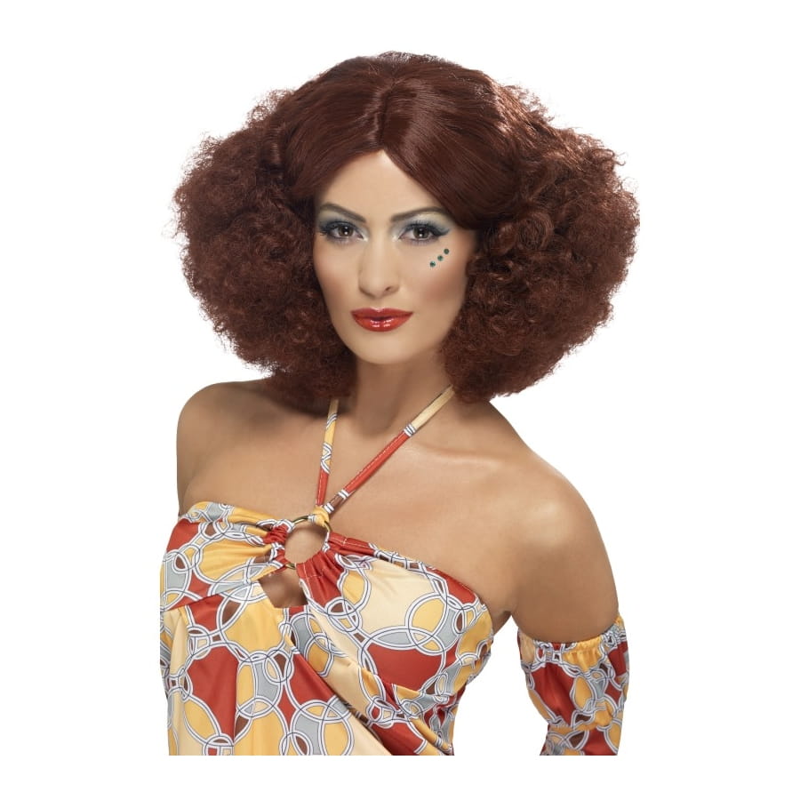 Cette perruque des années 70 a été très à la mode pendant un long moment! Tout lisse sur le dessus de la tête avec une raie au milieu et un style afro pour le reste des cheveux (volume et effet frisé), cette perruque d'une belle couleur châtain est à porter avec des vêtements de couleurs vives lors d'une soirée à thème années 60 ou années 70!