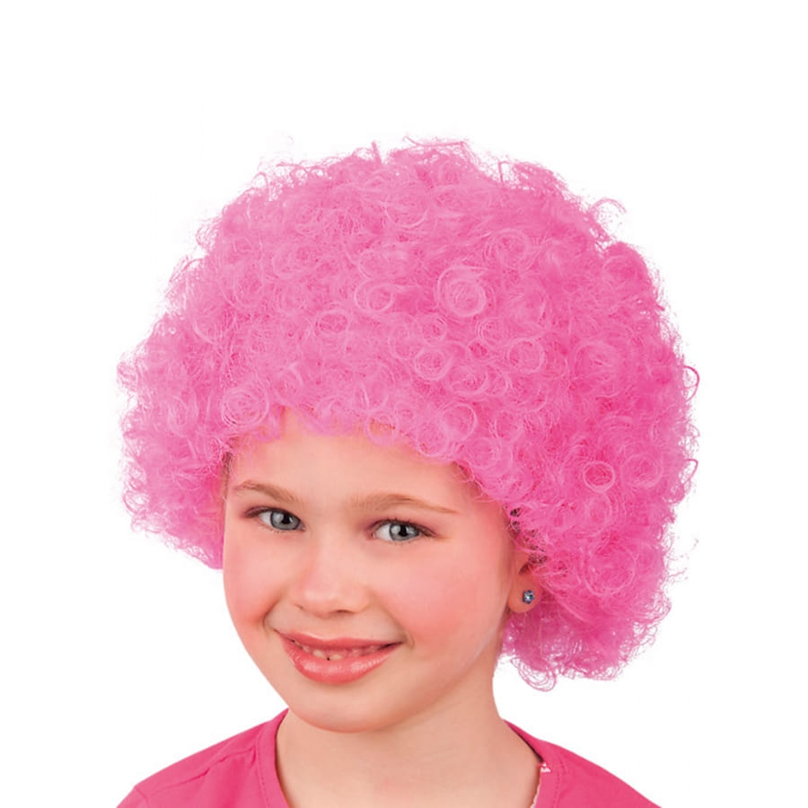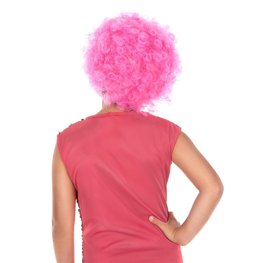 Faite en cheveux synthétiques frisés, cette perruque rose sera parfaite pour compléter un costume disco ou un déguisement de carnaval.