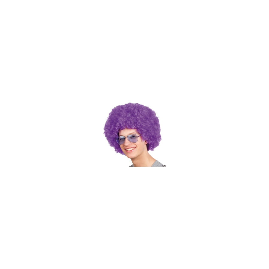 Perruque volumineuse afro frisée violette, pour homme ou femme. Cet accessoire est équipé d'un filet élastique pour vous permettre de mieux l'adapter à plusieurs déguisements. Avec cette perruque, vous complèterez avec aisance un déguisement de clown ou de danseur disco.