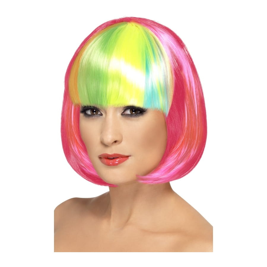 Pour le carnaval pourquoi ne pas porter cette perruque. Vous serez vraiment très belle avec cette perruque rose . Tout le monde aura des yeux rien que pour vous. Elle est lisse, elle arrive jusqu'au menton. Avec une frange épaisse de couleur vert et jaune.