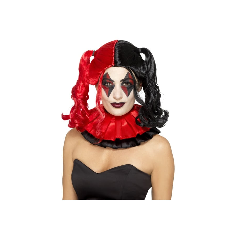 Mesdames, la perruque arlequin rouge et noire avec couettes reste l'accessoire qu'il vous faut si vous recherchez l'originalité pour votre costume d'halloween. Cet article reste disponible sur notre site. Cette chevelure s'attache sur les deux côté de la tête grâce à deux petits élastiques. L'une des couettes est de couleur rouge et l'autre noire. Elle présente également deux petites mèches tombantes qui ont respectivement les mêmes couleurs.