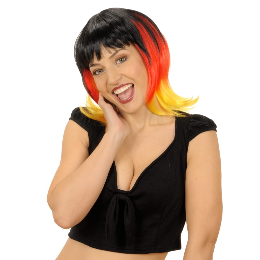 Cette postiche mi-longue à frange en mode noir, jaune et rouge est destinée à toutes les fans inconditionnelles de foot.