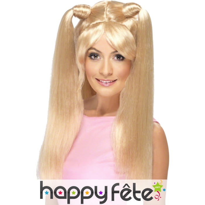Perruque pour femme ou adolescente entièrement inspirée du style d'Emma ou Baby Spice, du groupe Spice Girls. La perruque possède une frange, 2 couettes et de longs cheveux blonds. Avec cette perruque, vous pourrez revivre les années de folie de la pop anglaise!