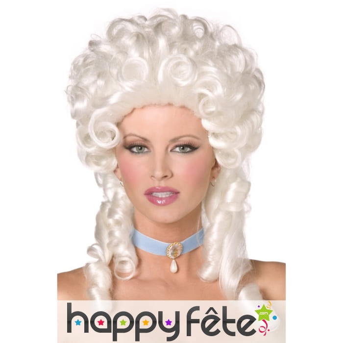 Perruque baroque de couleur blond platine pour femme. Cet accessoire est composé d'une multitude de boucles très soigneusement coiffés en un chignon avec des mèches sur le cou. Utilisez-la pour un déguisement de marquise ou de personnage médiéval.