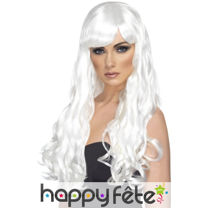 Perruque de couleur blanche pour femme. Composée de longues boucles lisses et d'une frange sage, cette perruque pourra servir à agrémenter un déguisement d'ange ou d'autre personnage fantastique.