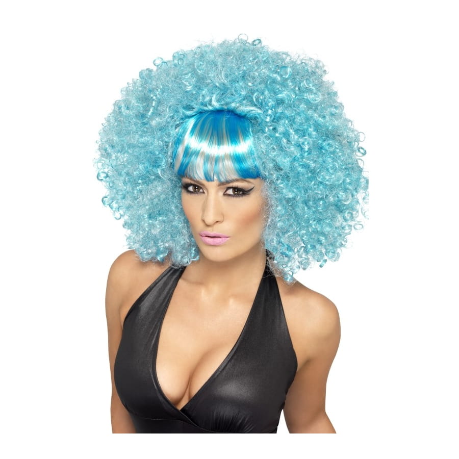Une popstar débarque sur scène ! Évidemment, tout le monde va envier votre coiffure sortie d'un clip ultra-tendances ! Vous disposerez d'une sublime perruque afro à frange, dans une couleur très attrayante : bleu azurin. Il vous suffit de vous maquiller un peu et de porter un haut un peu décolleté pour ressembler à une célébrité des années Disco ! Effet sensationnel assuré!