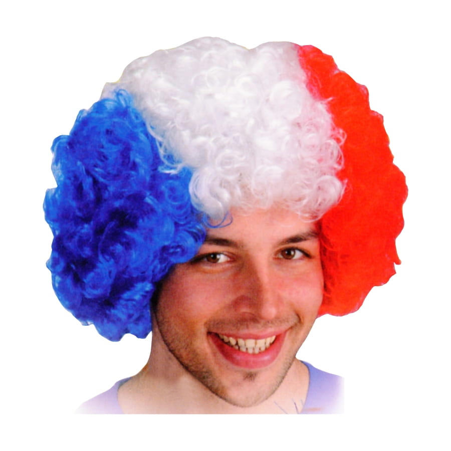 Perruque pour homme de qualité de luxe de couleur bleu, blanc et rouge, inspirée du drapeau de France. Avec cet perruque, vous pourrez aller encourager votre équipe lors d’événements sportifs.