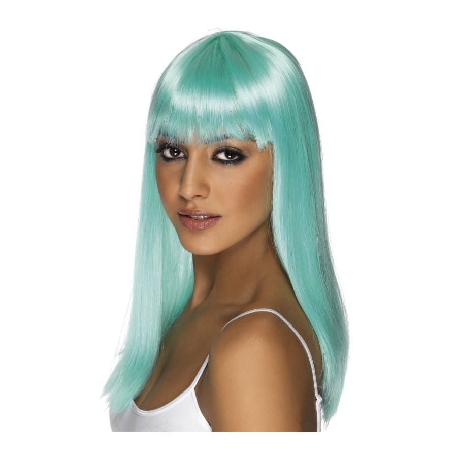 Perruque glamour de couleur turquoise, pour femme. Cette perruque est constituée de longs cheveux lisses et droits et d'une frange. La couleur vous permettra de l'utiliser pour un déguisement de personnage fantaisiste.