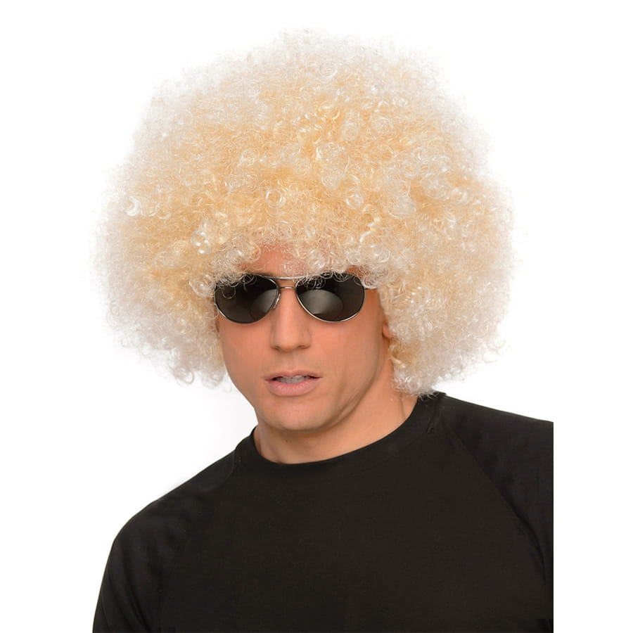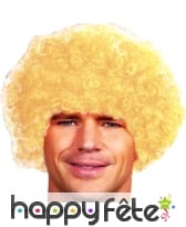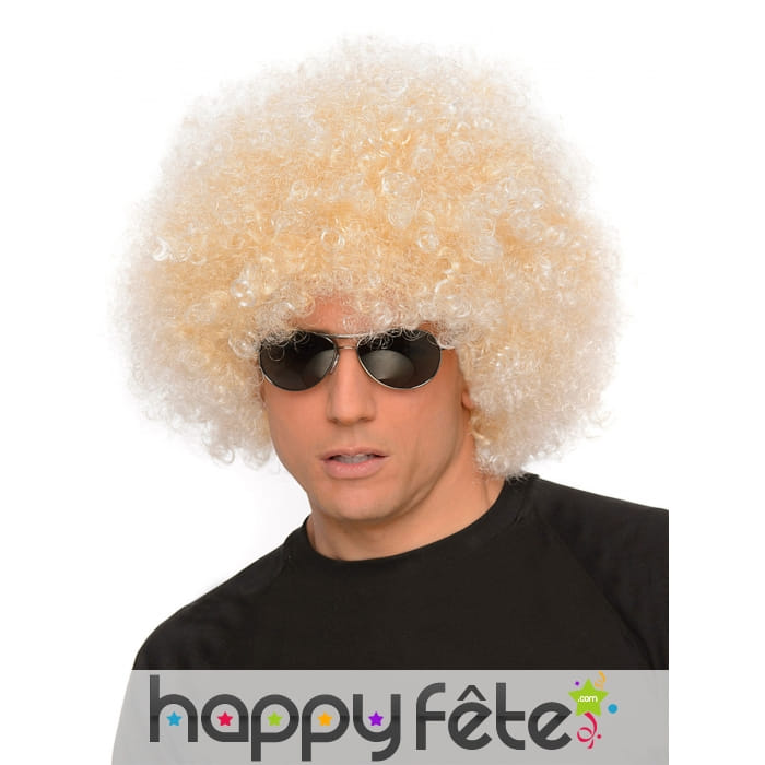 La perruque blonde afro taille adulte est faite de cheveux synthétiques bouclés formant un rond volumineux.