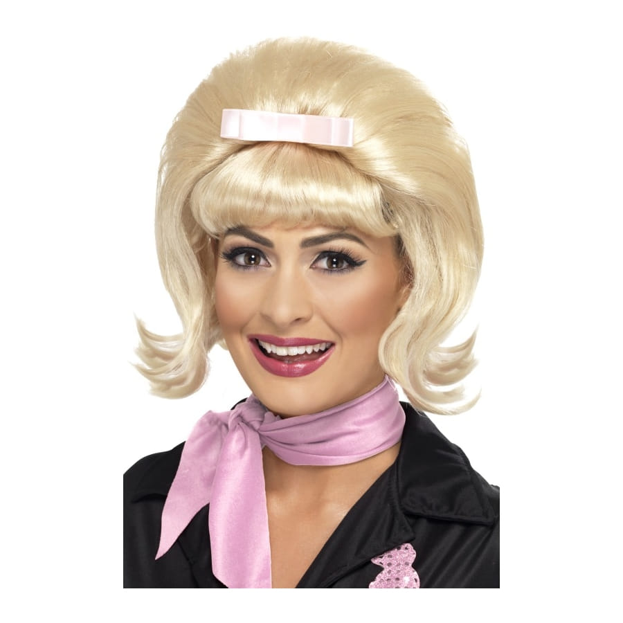 Cette perruque vous pourrez vous en servir pour incarner une femme des années 50. Vous pourrez porter cette perruque pour un enterrement de vie de jeune fille ou encore pour le carnaval. Cette perruque est blonde, elle est courte et se courbe a l’extrémité, assez volumineux a la racine, elle a une frange et un petit nœud rose.
