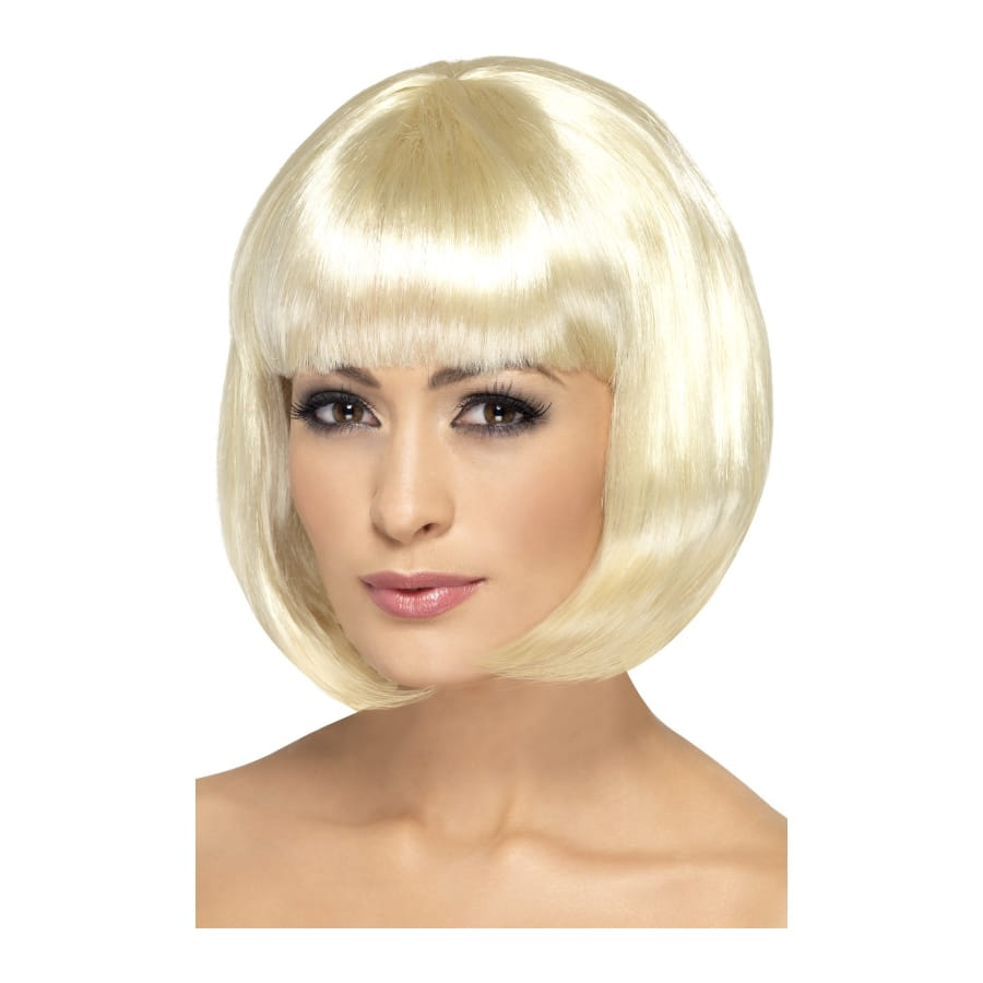 Perruque de couleur blond clair pour femme. Cet accessoire est coupé court et carré avec une frange, épousant parfaitement la forme du visage. Elle peut vous donner un air élégant, sexy ou sérieux, dépendant des accessoires auxquels vous l'associez.