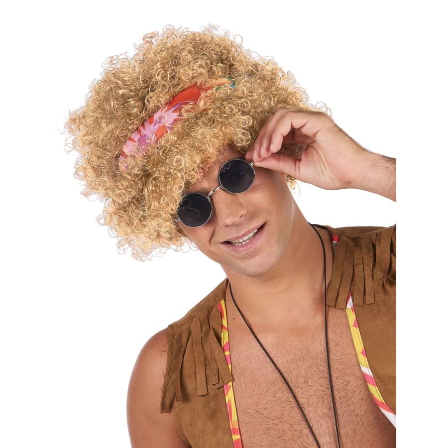 Peaufiner les détails d'un costume qui s'inscrit dans le style Hippie avec la perruque blonde frisée afro style hippie.