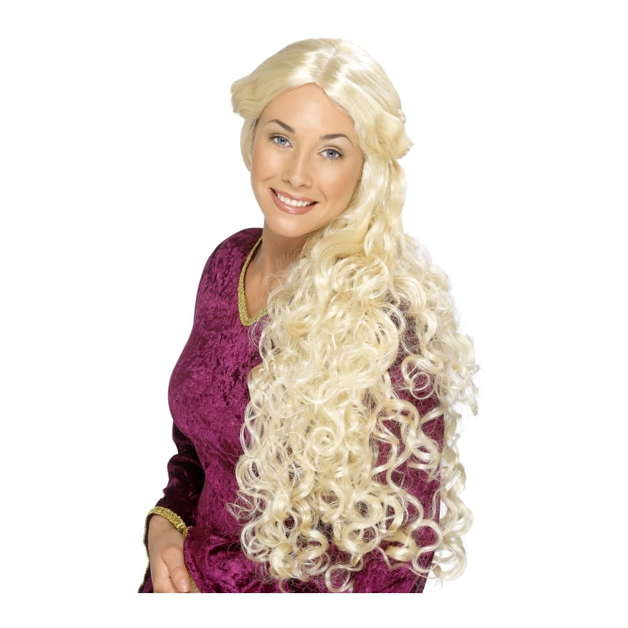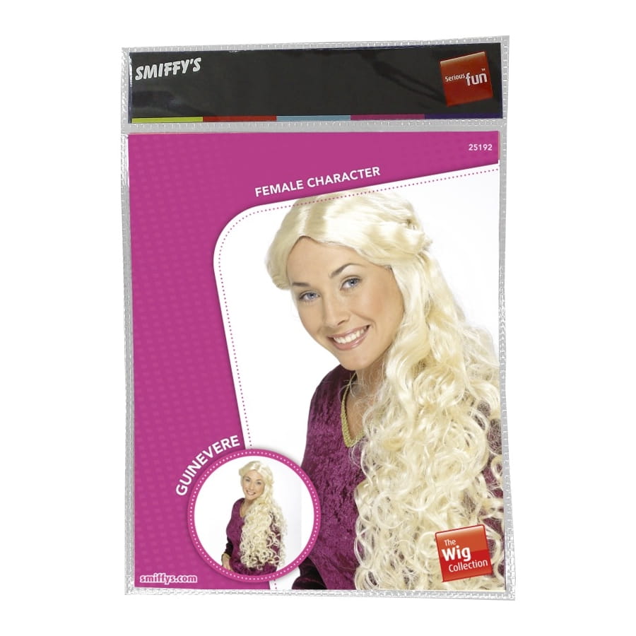Perruque de Guenièvre de couleur blonde, pour femme. Cet accessoire est constitué de longs cheveux bouclés et soigneusement attachés. Vous pourrez vous en servir pour compléter un déguisement de reine médiéval.
